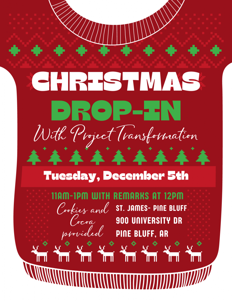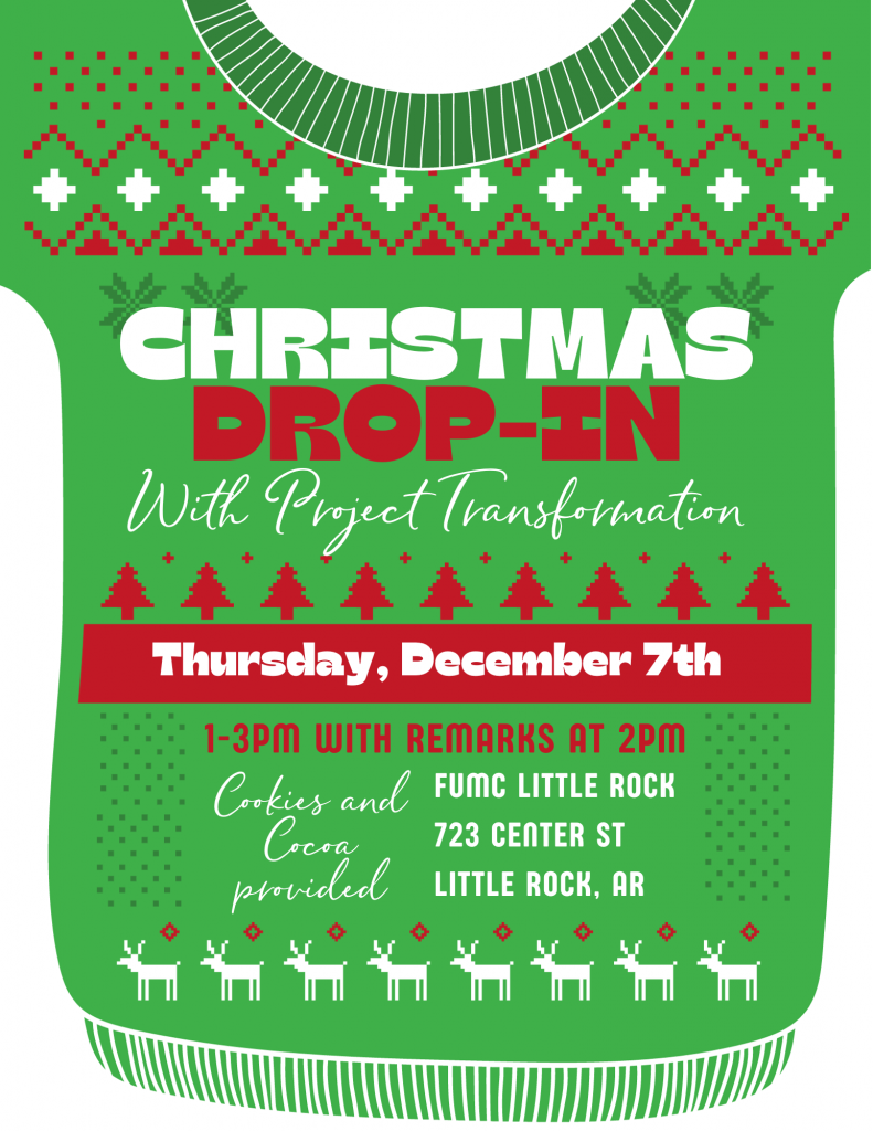 Join us for our first Christmas Drop-In with Project Transformation. Stop by in Pine Bluff at St. James UMC or in Little Rock at FUMC downtown to share in cookies and cocoa while hearing some of our highlights from summer.