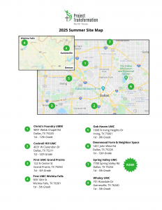 Registration for Project Transformation North Texas’ 2025 Summer Camp is OPEN! Camp will take place from June 3- July 24. This year we will be at 6 locations across greater Dallas, 1 location in Gainesville, and 1 location in Wichita Falls.