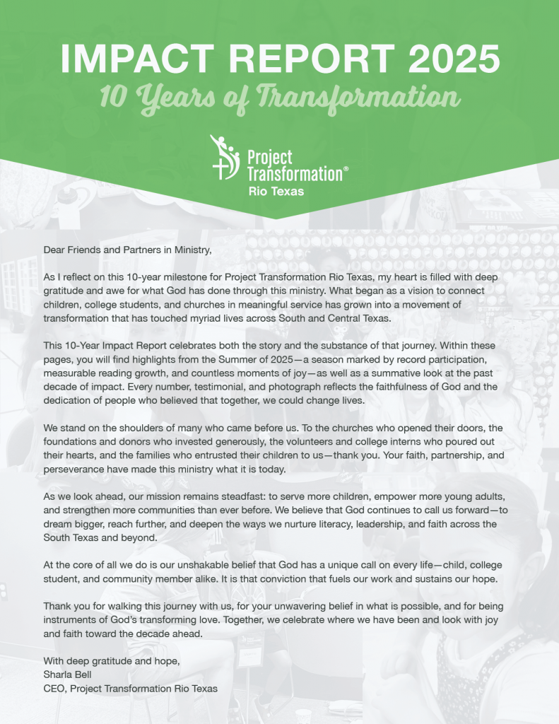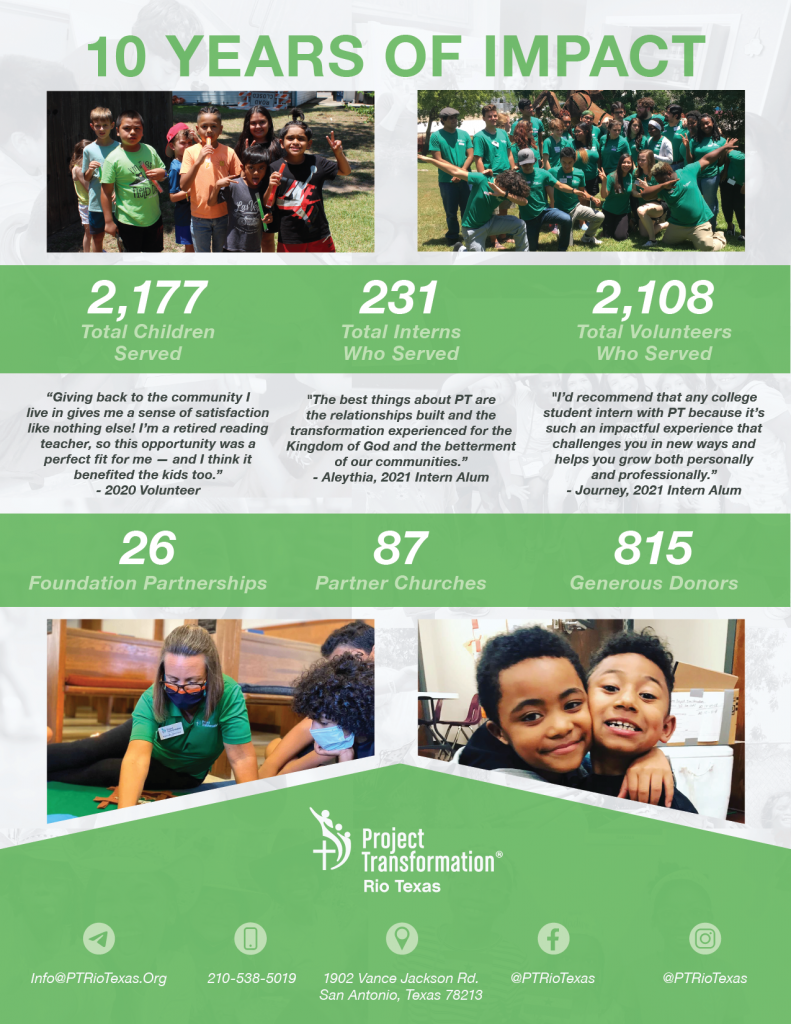 Through Project Transformation’s unique program design, we equip college-age young adults for leadership in the church and the world, empower children to achieve their God-given potential, and support churches in developing relationships with their neighbors. Click here for the PDF version of the Summary of Impact Report.